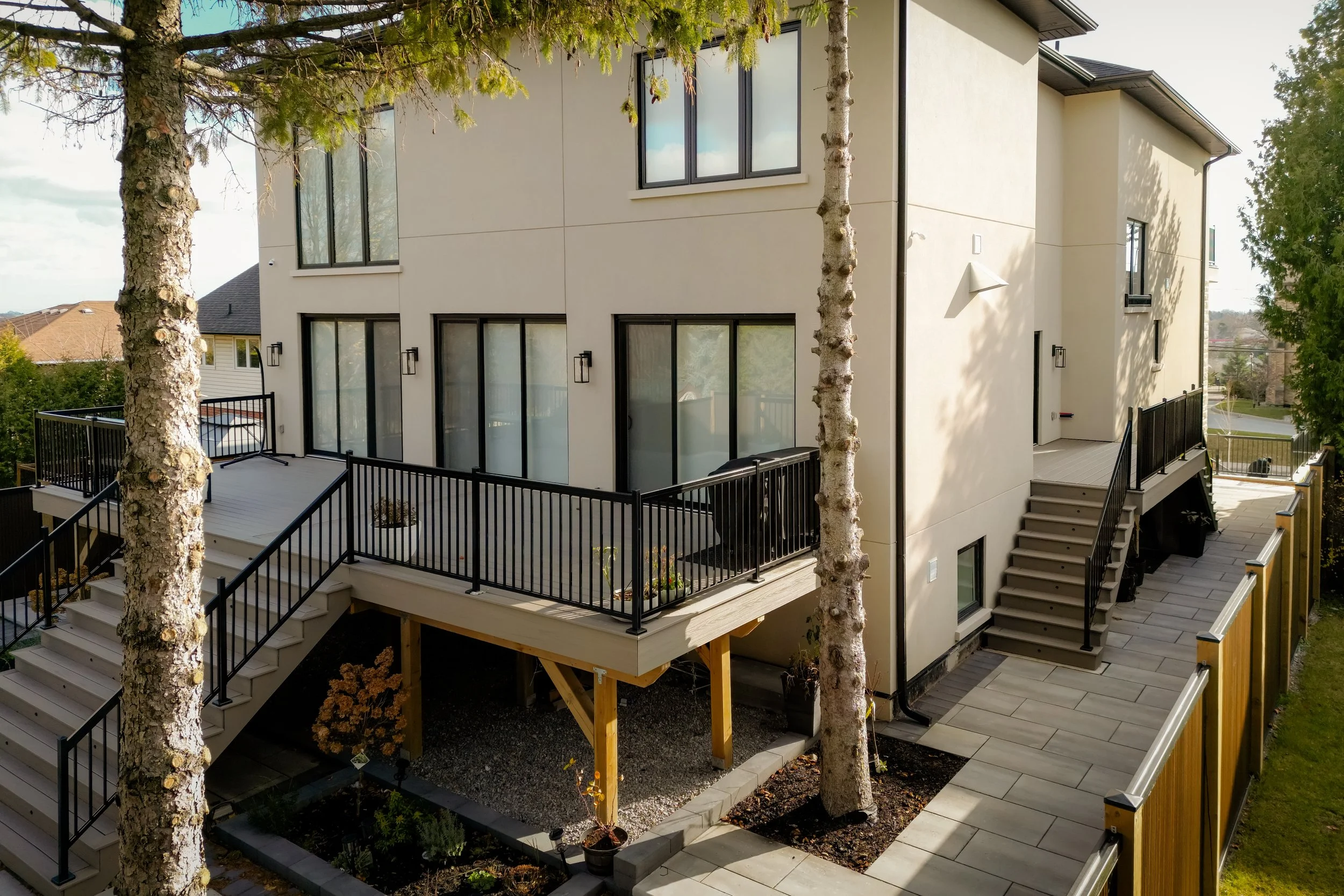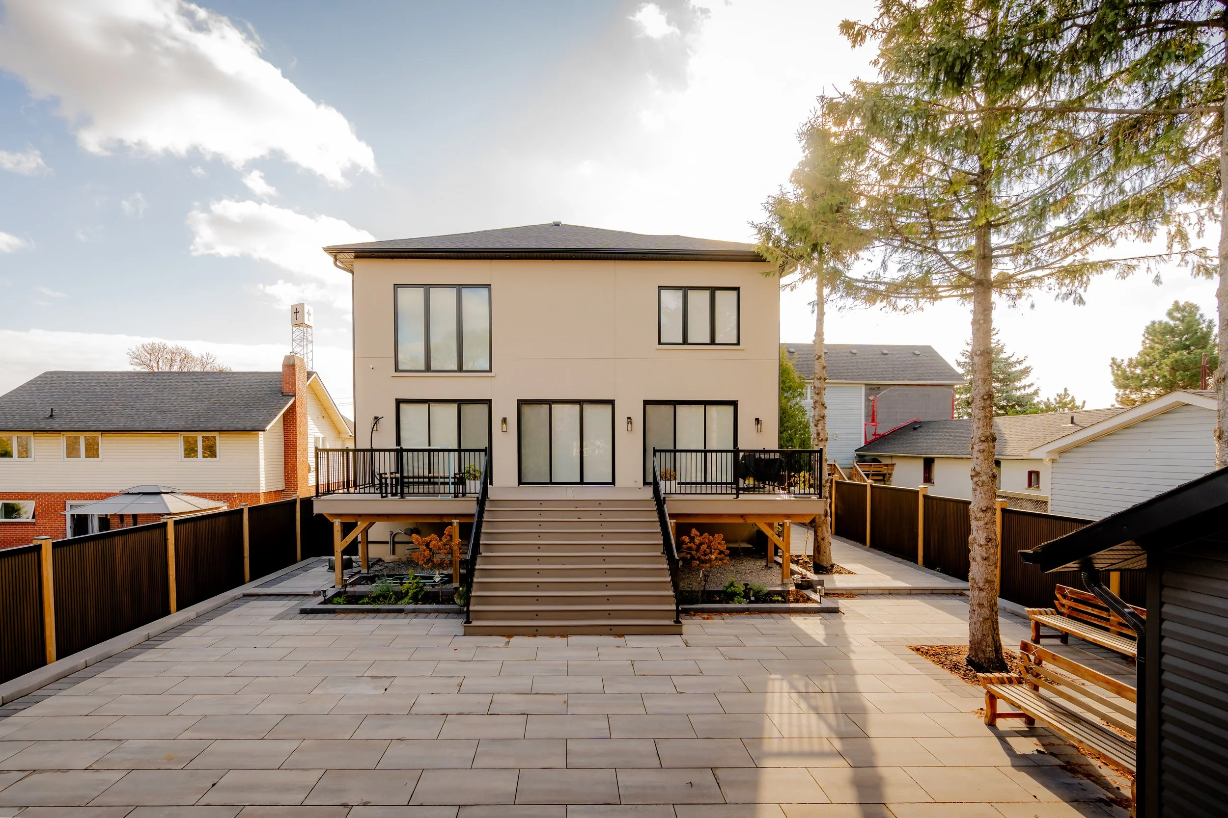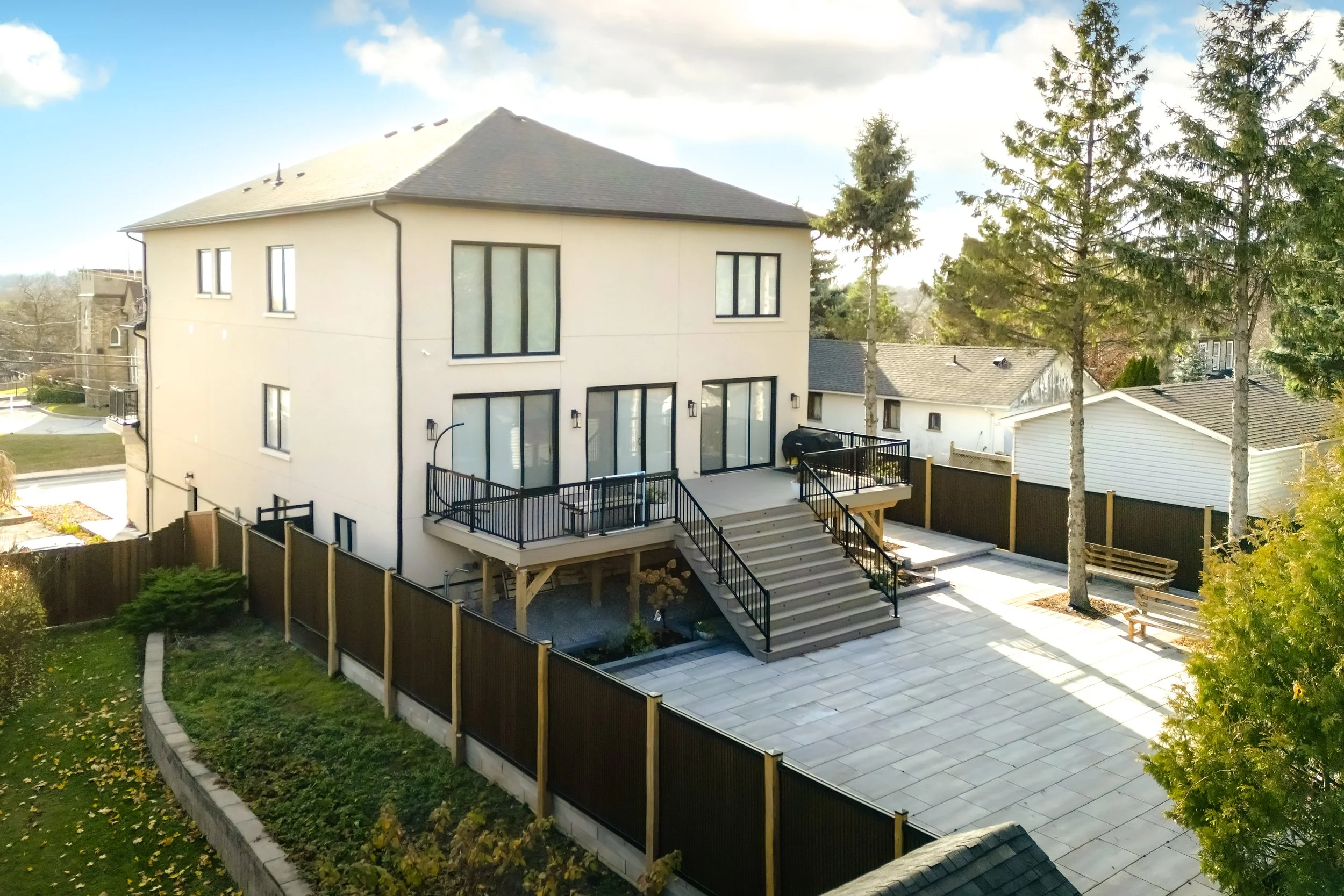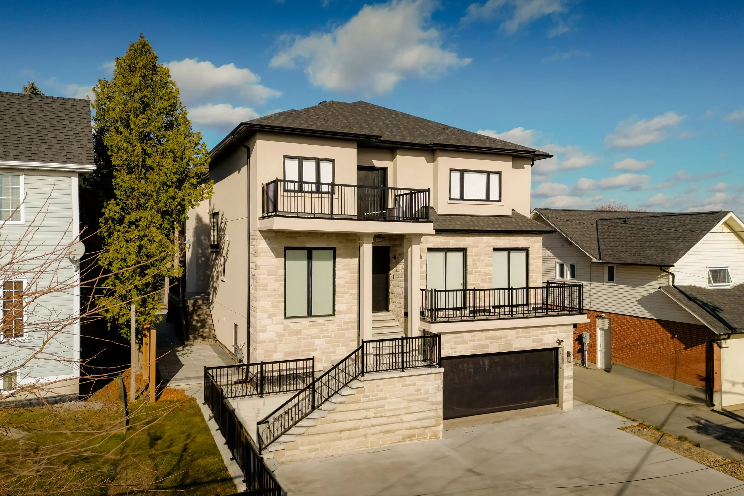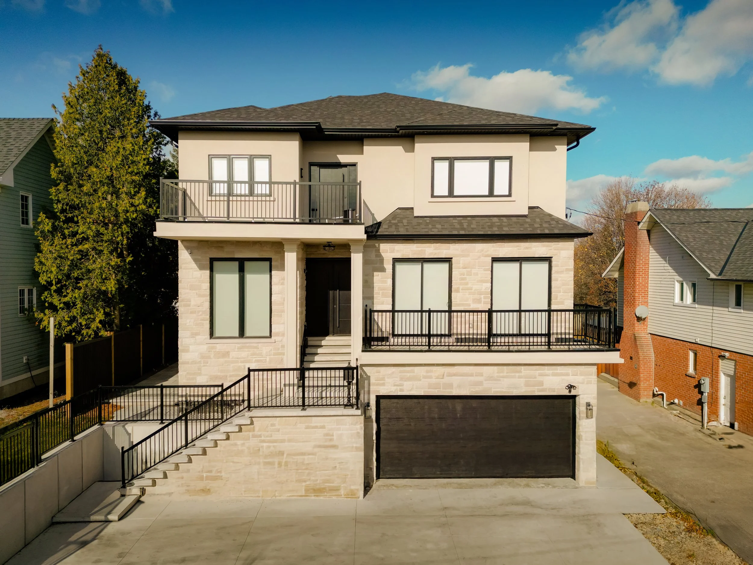 The home features expansive windows, tall ceilings, and a fully finished basement for added living and entertainment space. Custom touches including, detailed wainscotting and a standout balcony staircase, bring luxury and personality throughout.